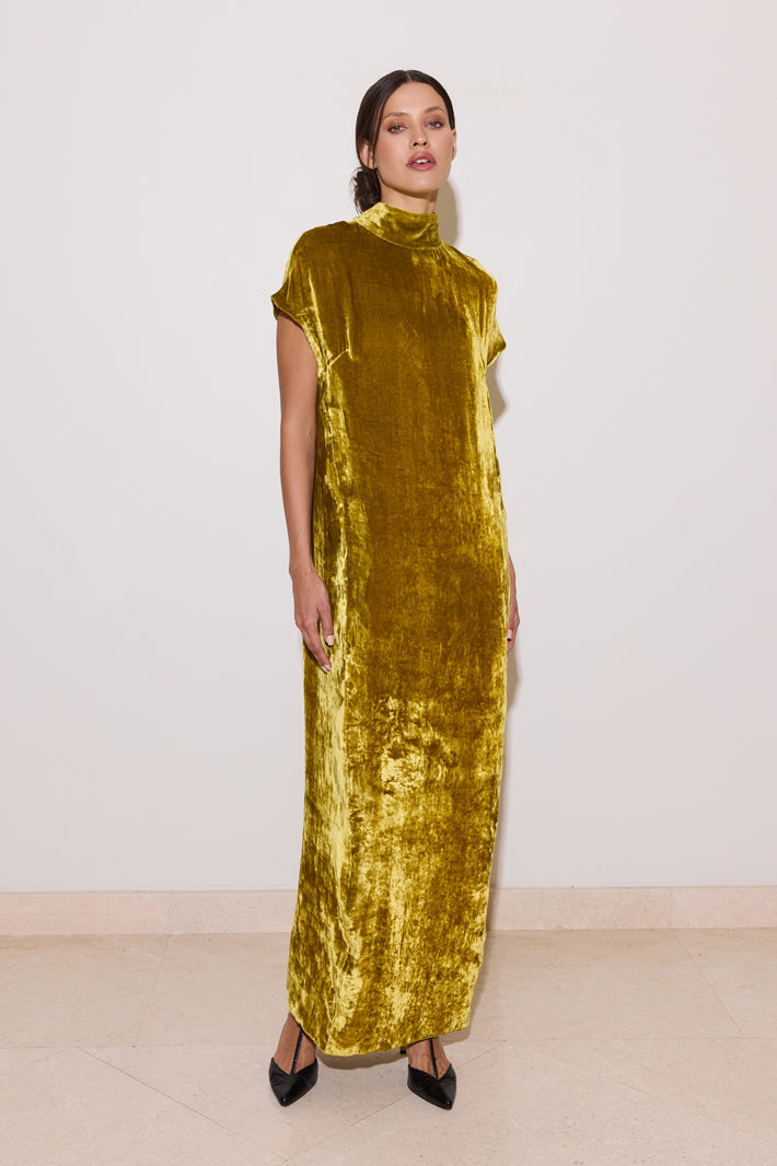 Elevate your evening wardrobe with the Adora Dress, a sophisticated piece crafted from luxurious citrine silk velvet. This refined design showcases a graceful high neckline that frames the shoulders with understated elegance, while the distinctive tulip silhouette creates a flattering, modern shape. A subtle back slit adds movement and contemporary flair to this timeless style. The dress arrives complete with an ivory belt adorned with intricate beadwork featuring rich brown beads and sparkling crystals, offering a polished finishing touch that enhances the overall aesthetic. Perfect for upscale events, formal gatherings, or occasions where you want to make a memorable impression, the Adora Dress combines luxurious materials with thoughtful design details for an effortlessly chic look.