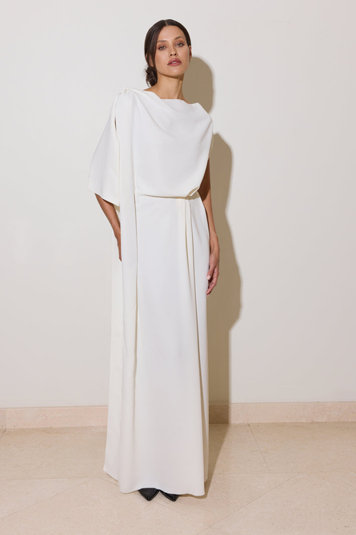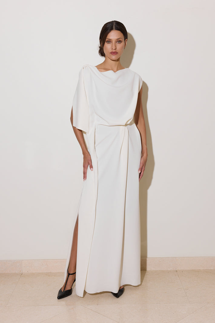 The Fauna Dress epitomizes refined elegance with its thoughtfully designed silhouette. Crafted from mid-weight ivory crepe, this asymmetrical draped piece creates a graceful, dynamic line that flatters the figure. An inner cinched waist provides definition and structure, while the discreet side zip ensures effortless dressing. Versatile by design, wear it as a standalone statement piece for understated sophistication, or elevate the look by pairing it with the coordinating honey sequined overskirt for added glamour and dimension. Perfect for occasions demanding both polish and presence