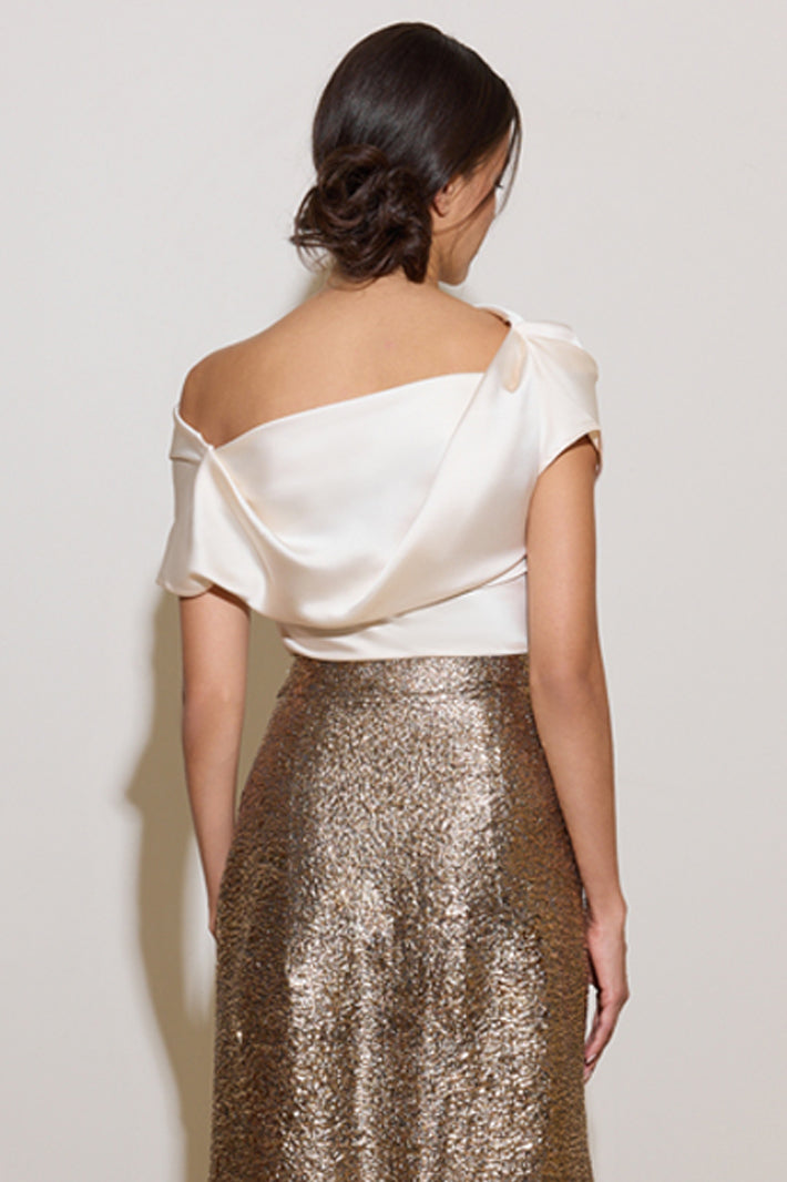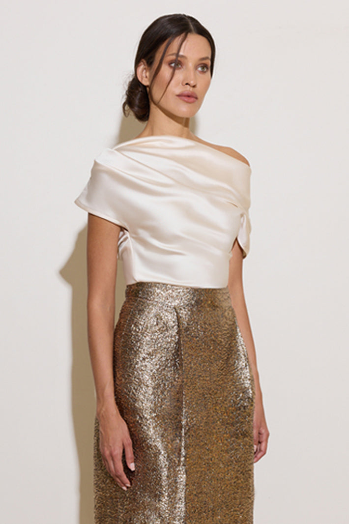 Elevate your wardrobe with the Lavina Top, a sophisticated piece that seamlessly blends contemporary design with timeless elegance. Crafted from luxurious cream silky crepe, this refined top features an asymmetrical draped silhouette that creates an effortlessly chic aesthetic. The bias-fitted construction hugs your curves in all the right places, while the discreet side zip adds both functionality and a modern design detail. Perfect for transitioning from office to evening occasions, this versatile top pairs beautifully with tailored trousers, sleek skirts, or your favorite denim for an instantly polished look.